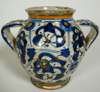 of ovoid form with twin handles, polychrome painted with Persian palmettes and with the drug name 'Pll.Cotie' within a scroll below the coat of arms of the Aldobrandini di Lipo family, the potter's mark Bo below the handle