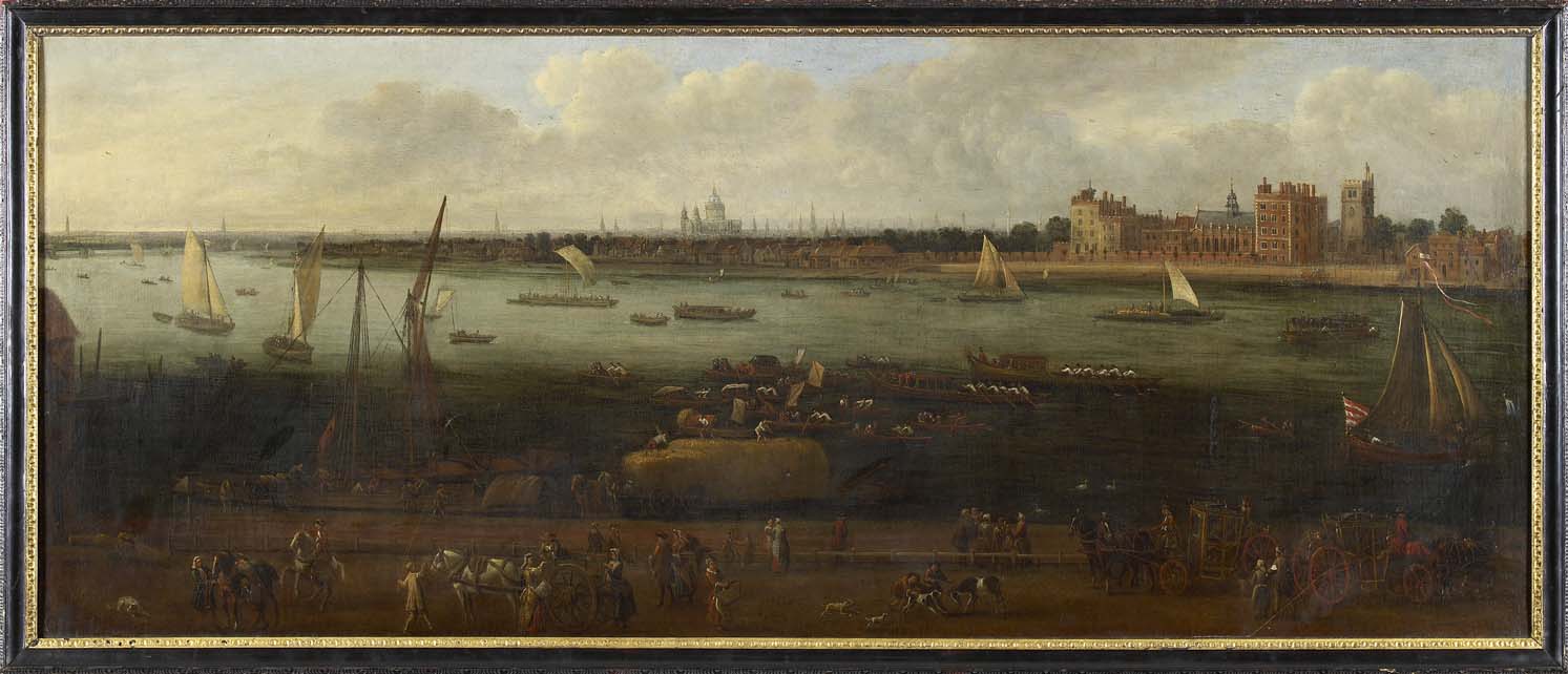 Note: This a rare early view of London from the north bank by Westminster Abbey looking across the Thames to Lambeth Palace with St Paul's Cathedral prominently featured in the distance. Lambeth Palace has been the historic residence of the Archbishops of Canterbury since the 13th century. This canvas must have been painted before 1736, when work began on Westminster Bridge which is located just north of Lambeth Palace and in the present day stands towards the left of the composition. Here however the view of the Thames is uninterrupted as it winds its way north. St Paul's dome is seen in the middle ground, identifying the composition as painted after 1709 when the cathedral was finally completed. The costumes of the figures in the foreground also date the canvas to the early 18th century.