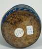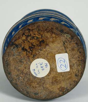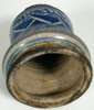 of waisted cylindrical form, painted in dark blue with overlapping pointed leaves, with yellow line rims