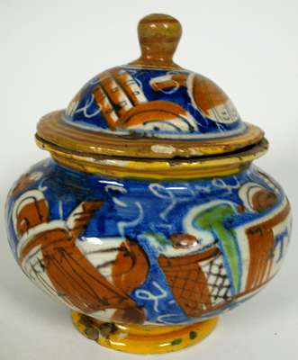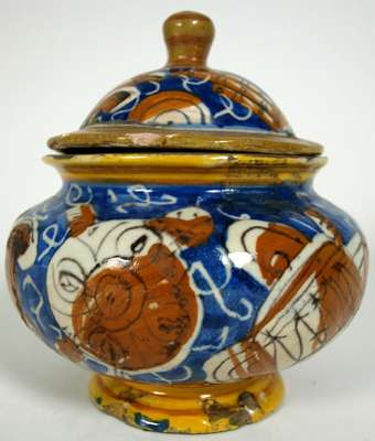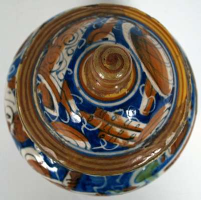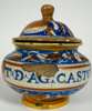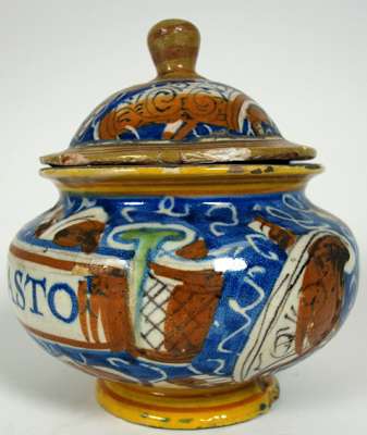 A late 16th century Pesaro or Castel Durante maiolica covered drug pot, circa 1575