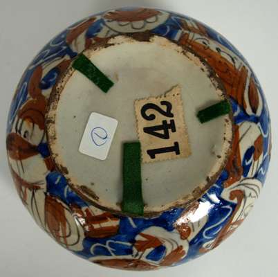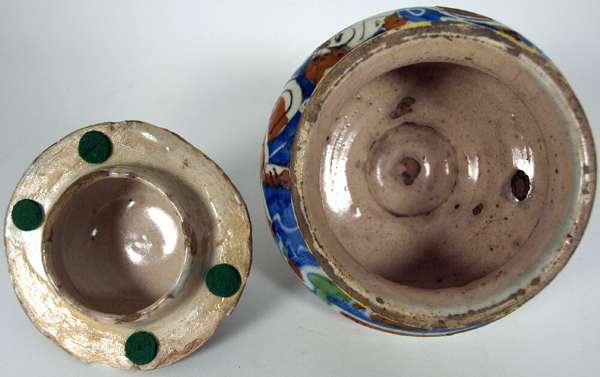 For a similarly shaped drug pot with a similar ground see Rudolf E. A. Drey, 'Apothecary Jars', (London, 1978), p61, pl24B
