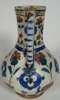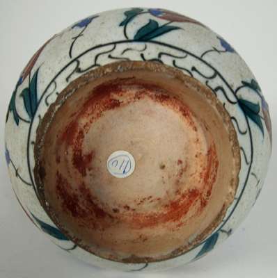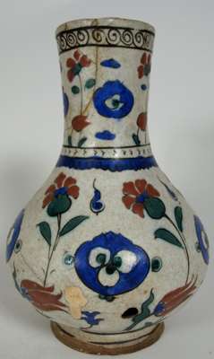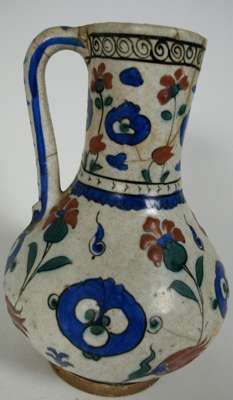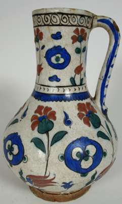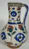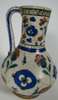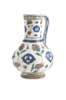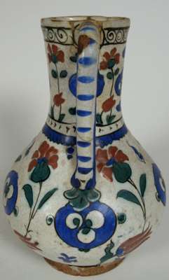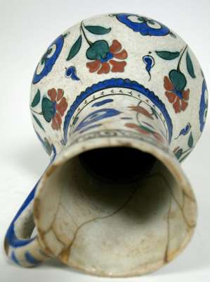 the slightly flared neck above globular body and single handle, painted in red, turquoise and blue with stylised tulips, carnations and fruit medallions (damages)