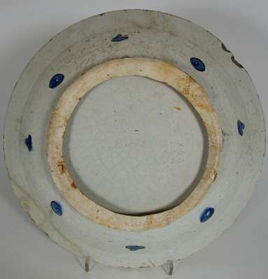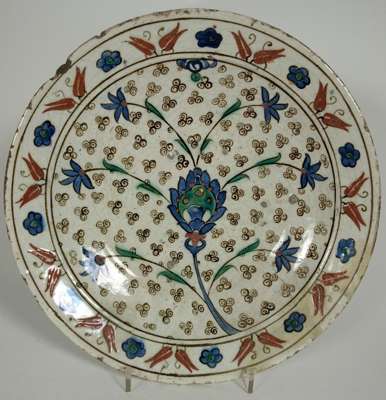 painted in blue, red, green and black with delicate flowering stems issuing from a central flowerhead, amidst spiral trefoils