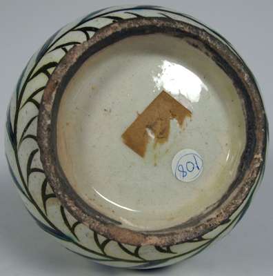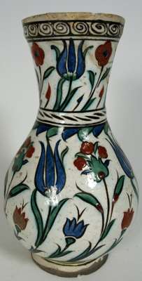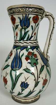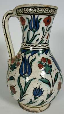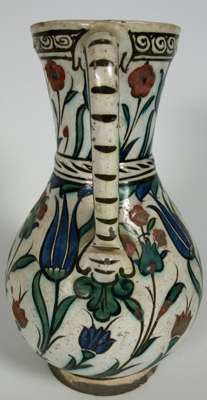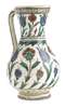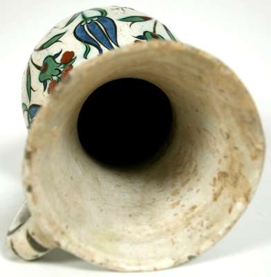 with a slightly flared neck above an ovoid body with single handle, painted to the body and neck in red, green, turquoise and blue with stylised tulips and carnations with black spiral border