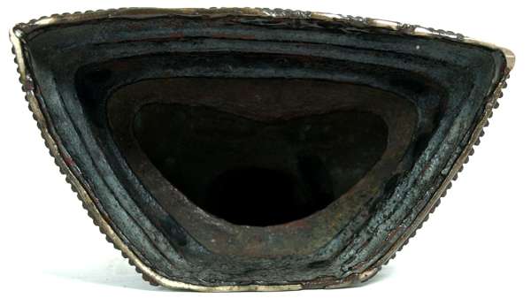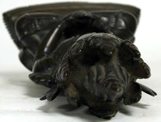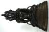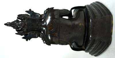 seated, wearing an elaborate head-dress and holding a lotus flower in his hands, on a stepped base