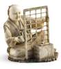 of a screen maker, seated on bamboo matting, the screen held in one hand, the other holding a mallet, his robe decorated with geometric and floral patterns, signed within an inlaid red lacquer tablet