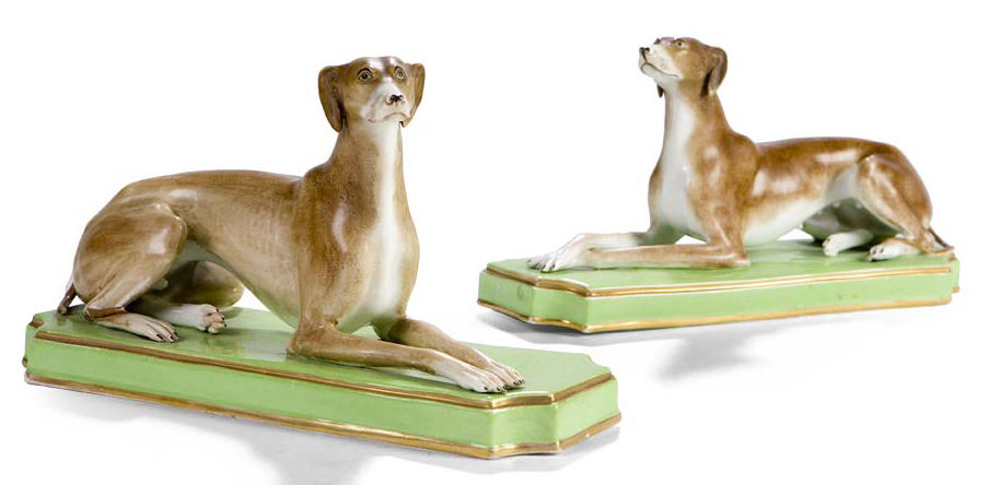 A pair of large 19th century Copeland & Garrett models of recumbent greyhounds, circa 1838-1847