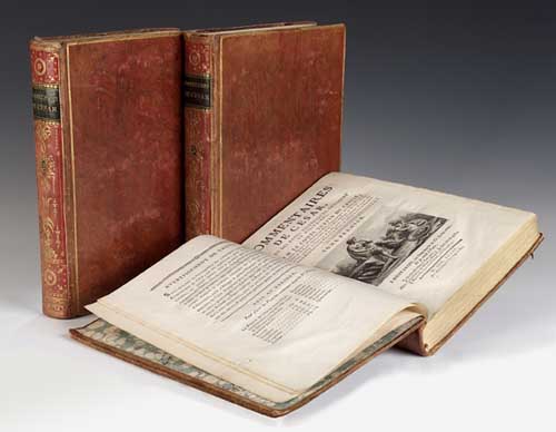 ... 3 volumes, engraved vignette on the titlepage of each volume, with engraved portrait plates of Turpin de Crissé and of Caesar, and 40 large engraved folding military plates, many on blue tinted paper, contemporary, polished mottled calf, red spines tooled with gilt ornaments of birds, urns and ribbons, etc., blue morocco lettering pieces, by the St. Petersburg binder, Frederic Reeb, corners and edges with a little wear, small tear at the lower margin of plate 32 in vol. 3 (no loss), 4to., Paris, 1775 [3]