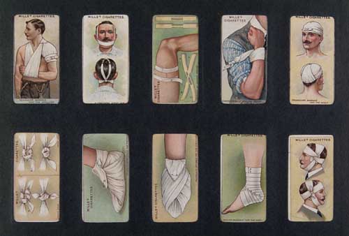5 volumes Will's cigarette card albums containing approximately over 900 cards (including some duplicates], including the following Wills's series: Signalling, Celebrated Ships, Historic Events, First Aid, Borough Arms, School Arms, Naval Dress & Badges, Aviation, Fish & Bait, Nelson Series, World Dreadnoughts, Arms of the British Empire, Old English Garden Flowers, Coronation, Royal Families, Arms of Bishoprics, Cricketers, etc. There also also a few cards from other manufacturers, Players, Drapkins, etc. [5]