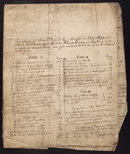 Loosely inserted are two inventories, the one of prints, pictures, etc. bought in Italy and shipped from Leghorn to Amsterdam, and the other of boxes to be sent to Scotland.