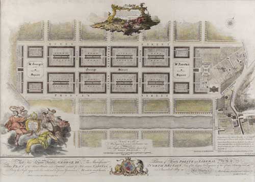 Note: "What makes Craig's New Town so pleasing ... even today? It cannot be the originality of its design. Craig was not original ... The principal reason for Craig's success ... is the excellent use of the site. The two outer streets - Princess Street and Queen Street - have houses on one side only, and these look outwards across the street, in the one case over low ground towards the Castle and High Street, in the other down the slope towards the Firth of Forth and the distant hills of Fife. This seeking of spaciousness combined with order is no doubt enhanced by the good proportion of the streets and buildings." - Youngson The making of classical Edinburgh p. 79