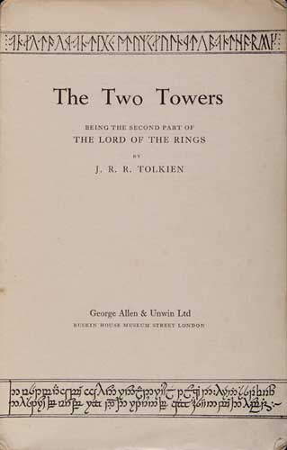 Note: This proof copy was given as a present to the writer Naomi Mitchison, whose family can recall her reading it to them. According to Mitchison family tradition, Tolkien carried out the final corrections on "The Two Towers" while visiting Naomi Mitchison at Carradale. In some places, the proof copy has text which was corrected or modified for the final edition; however it does not have any hand-written corrections. It does not include the folding map which would appear to have been completed later.
