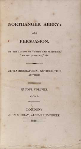 Note: Gilson A9 First edition of Jane Austen's last published book, consisting of the first novel, (originally called "Susan") she submitted for publication and her last novel respectively, as well a biographical essay by her brother Henry and some extracts from her private correspondence. Some 1750 copies were printed. Initial sales were rapid, totaling over 1400 copies leaving just over 300 with the publisher by the end of 1818 after the disposal of copyright and presentation copies.