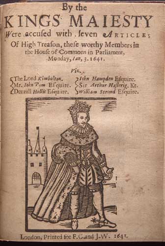 (x) By the Kings Maiesty were accused with seven articles of High Treason ... the Lord Kimbolton, Mr. John Pym [etc,] ... Woodcut vignette on the titlepage, pp. [ii], [5], verso blank, small 4to., London: printed for F.C. and J.W., 1641