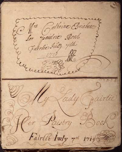 Recipe book of Mrs Catherine Brisbane, who is also described on the titlepage as Lady Fairlie. The book is dated July 1719 on the titlepage, with the first page of the text headed "Ane paistry book, 1718" The first part consists of almost 80 recipes for meat dishes, soups, sweetmeats, preserves, cakes, etc. There is an early recipe for Marmalade on p. 19. The second part of the manuscript contains a number of recipes for dying. 45 MS leaves. Contemporary paper wrappers. small 4to.