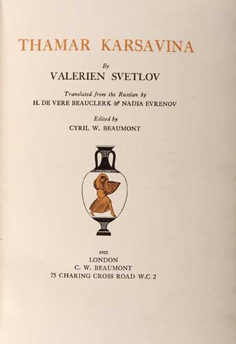 ... translated from the Russian by H. de Vere Beauclerk & Nadia Evrenov; edited by Cyril W. Beaumont ... 1st edition thus, mounted col. frontis. and 16 other plates of drawings (including 2 photographs mounted on linen, 15 further "camera portraits" mounted on linen, head and tail pieces by Claude Lovat Fraser and some drawings hand coloured, quarter vellum, decorated paper boards, fore-edges uncut, corners lightly worn, folio, London: Beaumont, 1922
