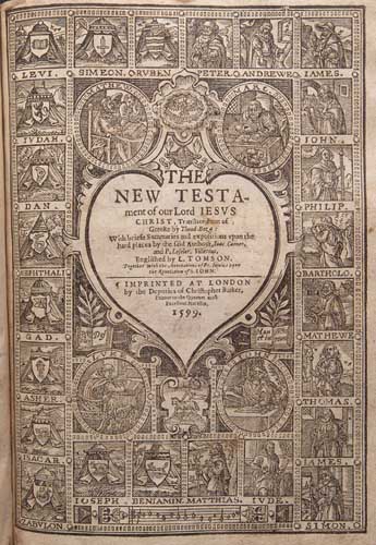 The Bible ... translated according to Hebrew and Greeke, and conferred with the best translations in divers languages ... Numerous woodcuts in the text, woodcut titlepage to the New Testament, pages dusty and with some discolouration throughout, p. 67 with tear in lower margin (no loss), tear in p. 41 of the New Testament affecting a few words of text and marginal notes, tear in p. 115 (no loss), later diced calf, upper cover detached, 4to., London: by the deputies of Christopher Barker, 1599
