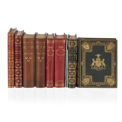 Anderson, John. Historical and Genealogical Memoirs of the House of Hamilton. Edinburgh: John Anderson, Jun., 1825. First edition, 4to (31 x 23cm), 324 409-12 *321-*324 325-408 [4] pp., near-contemporary red morocco richly gilt by Clarke and Bedford, broad turn-ins with elaborate foliate roll gilt, red moiré silk doublures, gilt gauffered edges, engraved frontispiece, plate facing p. 409, list of subscribers to rear, extra-illustrated with engraved arms of the dukes of Hamilton (on india paper, mounted), frontispiece offset, bookplate of T. Dawson Turner to initial blank, pencilled annotation ‘From the Beckford lib' to front free endpaper, early-20th-century printed catalogue description for the present copy laid in, annotated Large paper copy. From the Beckford library’. Housed in custom marbled card case (now defective) with 2 related items, comprising: William Aiton, An Inquiry into the Pedigree, Descent, and Public Transactions of the Chiefs of the Hamilton Family, Glasgow: Andrew Young, 1827 (8vo, wrappers); and Memoirs of the House of Hamilton, Corrected, with an Addition, Edinburgh: John Stevenson, 1828 [bound with:] Reply to the Misstatements of Dr Hamilton of Bardowie in his Late “memoirs of the House of Hamilton, Corrected,” Edinburgh: John Stevenson, 1828 (2 works in 1 volume, 4to, wrappers);