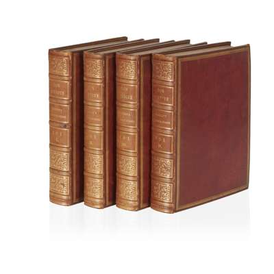 Translated from the Spanish. Embellished with Engravings from Pictures painted by Robert Smirke, Esq. R. A. London; for T. Cadell and W. Davies, 1818. First edition, large-paper copy, 4 volumes, 4to (27.6 x 22cm), contemporary diced russia, spines gilt in compartments, five-fillet borders gilt to covers, all edges gilt, 48 engraved plates and 8 engraved head- and tailpieces, all on india paper, mounted, mezzotint frontispiece (not mentioned in list of plates), engraved bookplates, 19th-century ownership inscription to volume 1 endpaper