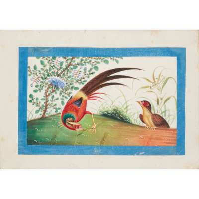 Oblong 4to, contemporary Chinese binding of patterned red silk with green cloth ties, containing 12 watercolours on pith paper, depicting birds against a variety of backdrops, each mounted to separate paper sheet within onlaid blue paper border, painting dimensions 10.5 x 17cm, mount dimensions 16.5 x 23.5cm, wear to binding, one painting with substantial loss to body of bird