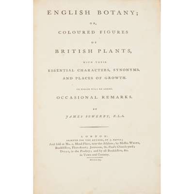 Or, coloured figures of British Plants… London: printed for the Author, by J. Davis, and sold at No.2 Mead Place, near the Asylum; by Messrs. White…, 1790-1814 [and 1881-1849: 4 supplementary volumes]. 39 volumes in 20, coloured plates, modern green half morocco, some foxing and darkening in places, occasional offsetting (20)
