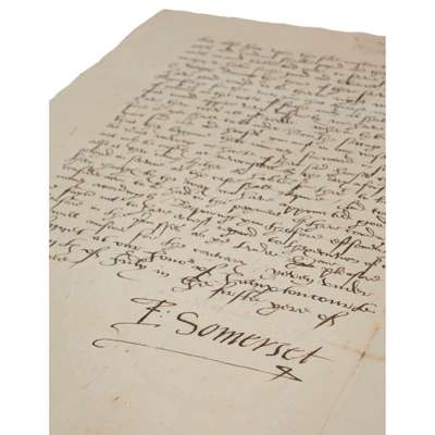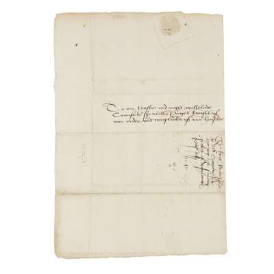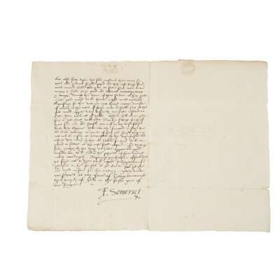 single bifolium (29.5 x 20.8cm, hand and flower watermark), written on two sides in a secretary hand, Edward's woodcut sign-manual to head, autograph countersignature of Edward Seymour, Duke of Somerset as Lord Protector ('E. Somerset') to foot, addressed ‘To our trustie and right wellbeloved counsellor Sir William Paget knight of our order and comptroller of our household’ on verso of conjugate blank, wafer seal and contemporary endorsement to the same, short split to head of central fold, short tear to lower inner corner of first leaf, neither affecting text, a few other small holes