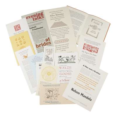 32 individual items, including: “A Man and a Brother”, Graham Moss at the Incline Press, single sheet comprising a quotation from Nelson Mandela; Trant, Carolyn. Art for Life. A Prospectus from the Incline Press, 2004; OPening verse from John Donne's “The Sun Rising”, small single leaf produced for an exhibition at Chetham's Library in 2011, Incline Press; Rosetti, Christina. On the death of a cat… printed by Thomas Mouser at his Catnip Press; and a quantity of others