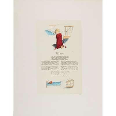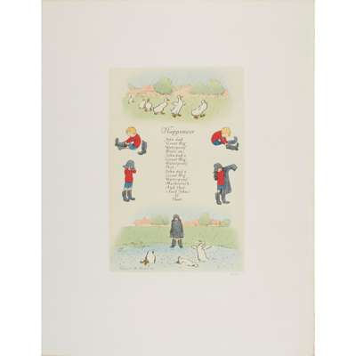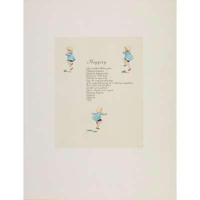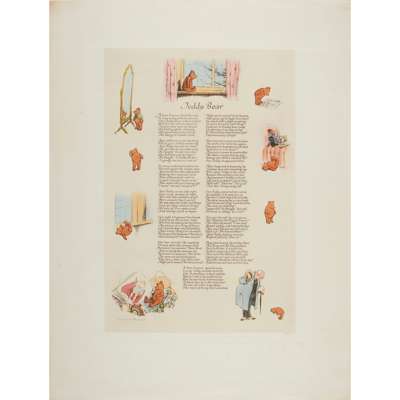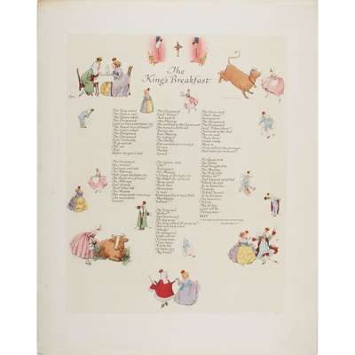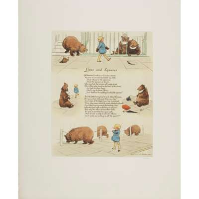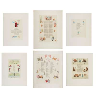 [London: Methuen, c.1925]. One of 250 numbered sets, 6 hand-coloured engravings on wove paper, each numbered in pencil lower right, tissue-guards, titles comprising: Teddy Bear (61 x 49cm, no watermark), The King's Breakfast (61 x 49cm, no watermark), Happiness (50.5 x 38.5cm, watermark ‘English Hand Made’, tissue-guard renewed), Hoppity (50.5 x 38.5cm), Lines and Squares (50.5 x 38.5cm, watermark ‘W King Alton Mill’), Vespers (50.5 x 38.5cm, watermark ‘W King Alton Mill’). A few minor spots and marks, Teddy Bear, King's Breakfast and Vespers tissue-guards with figures on print traced in pencil