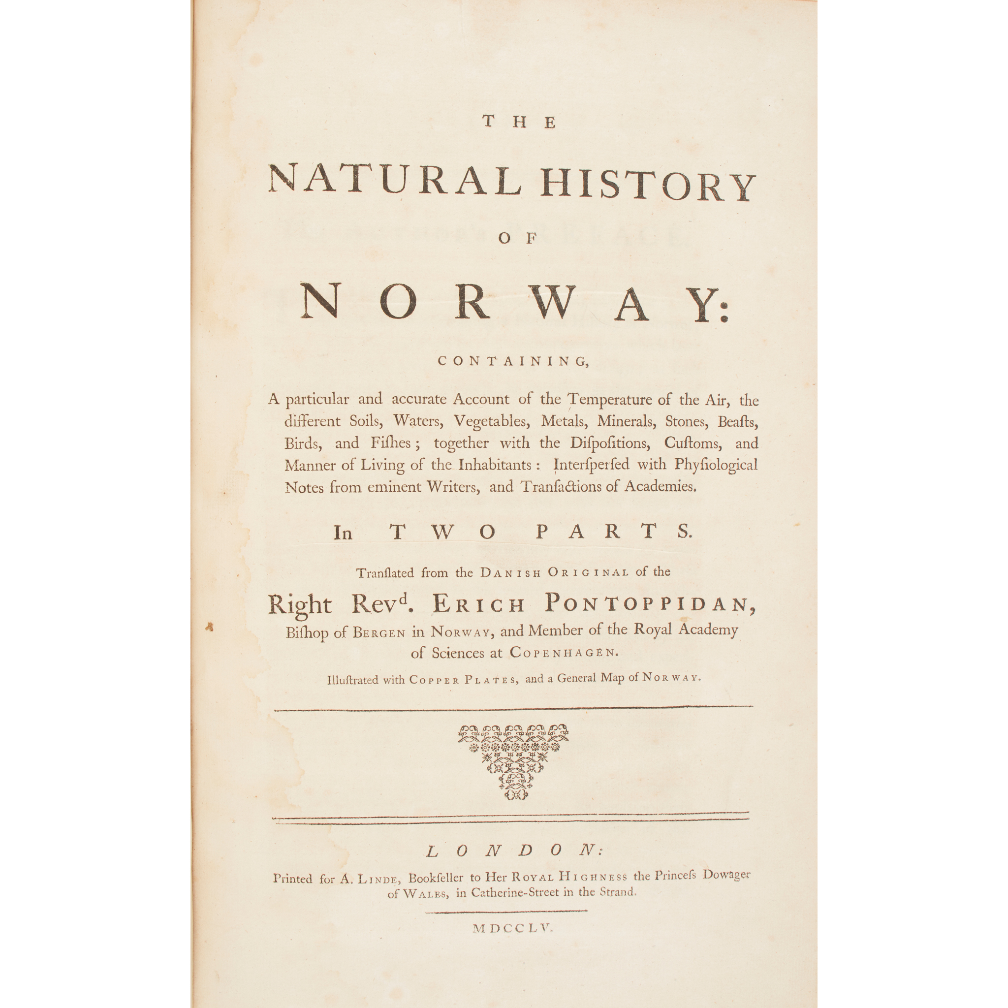 London: A. Linde, 1755. Folio, 2 parts in one volume, folding map, single-page maps, and 27 plates, some marginal dampstaining, a little foxing, lacking Kkk2 (pp.219-20 in Book 2); [BOUND WITH] Horrebow, N. The Natural History of Iceland. London: A. Linde, 1758. Folio, folding map, a little light dampstaining to upper margins, extending to inner margins towards rear, a little browning; contemporary calf with spine neatly rebacked, bookplates of Charles de Laet of Lincoln's Inn