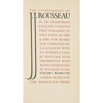 [Nonesuch Press] Rousseau, J.J. The Confessions of J.J. Rousseau. London: The Nonesuch Press, 1938. 2 volumes, 8vo, title-pages in red and black, original calf, some dampstaining to spines (4)