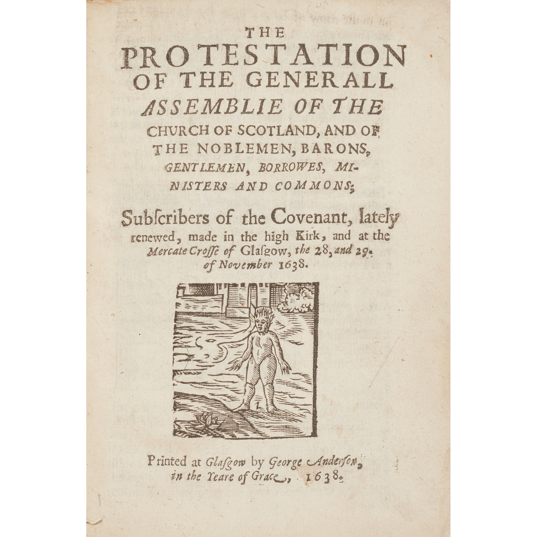 First and only edition of the earliest known book or pamphlet to be printed in Glasgow. The printer George Anderson had previously worked in Edinburgh before being invited to Glasgow by the town council in 1638. Sir Archibald Johnston, co-author of the National Covenant with William Henderson, visited Glasgow in July 1638 in order to obtain support from the the principal of the university and other leading figures in the city.