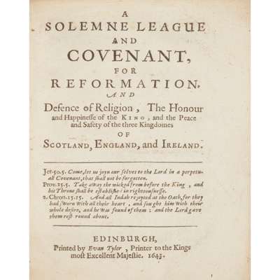 for Reformation, and Defence of Religion, the Honour and Happinesse of the King, and the Peace and Safety of the three Kingdomes of Scotland, England, and Ireland. Edinburgh: printed by Evan Tyler, printer to the Kings most Excellent Majestie, 1643. First edition, 4to (18.5 x 13cm), 19th-century maroon roan backing marbled boards, A-B4, 8 6 [2] pp., type-ornament headpieces, 4 woodcut factotums, woodcut initial, final leaf blank but for heading ‘The Subscribers of the League and Covenant’, pencilled inscription to binder's blank erroneously identifying the work with the National Covenant of 1638 [Wing S4441]