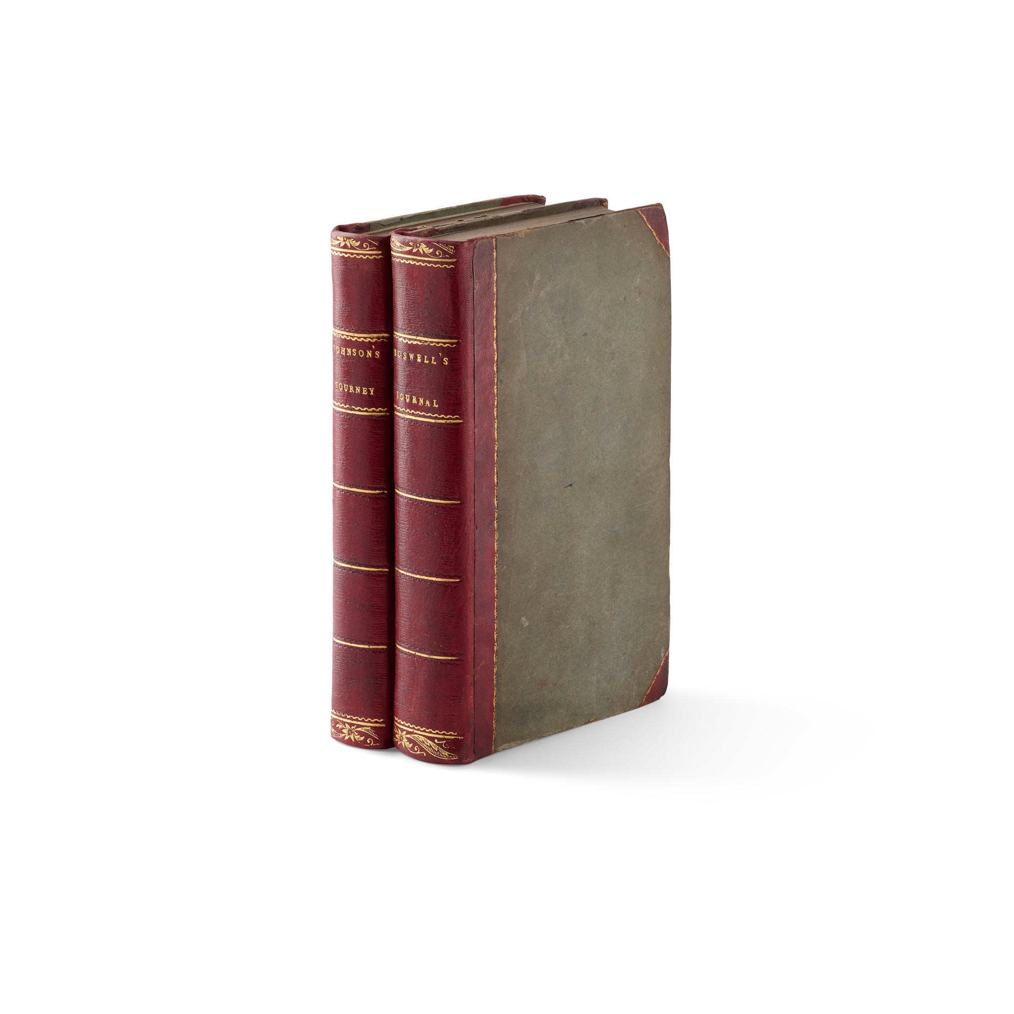 London: W. Strahan and T. Cadell, 1775. First edition, second issue, with 6 line errata bound between title and first leaf of text, U4 correctly numbered 296 on verso; Boswell, James. The journal of a tour to the Western islands with Samuel Johnson. London: Charles Dilly, 1785. First edition, 8vo, half-title, errata leaf at end with note announcing publication of Boswell's Life of Johnson, uniform contemporary red half morocco, very neatly rebacked, spines gilt (2)