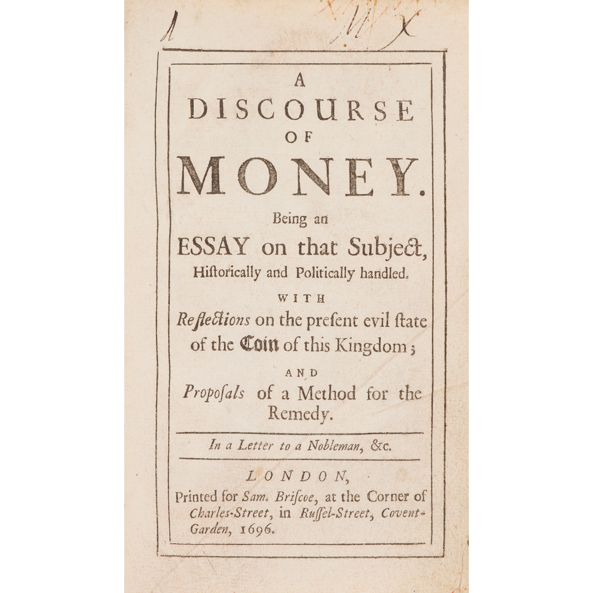 Being an Essay on that Subject, Historically and Politically handled. With Reflections on the present evil state of the Coin of the Kingdom; and Proposals of a Method for the Remedy. In a Letter to a Nobleman, etc. London: for Sam. Briscoe, 1696. First edition, 8vo (17.7 x 11cm), [4] 204 pp., contemporary sheep ruled in blind, red-sprinkled edges, early ownership inscription (possibly ‘abundanly [sic] well handled, John Child’) to front free endpaper, light wear to binding, faint crease to title-page, a few other marks [Kress 1936]
