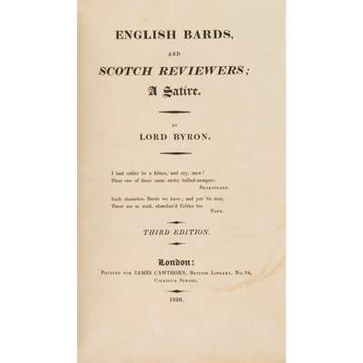 London: James Cawthorne, '1810' [but paper watermarked 1817.] "Third" edition, later engraved portrait bound in, half-title; [bound with] English Bards and Scotch Reviewers. London: James Cawthorne, 1811 [no watermarks.] Fourth edition, spurious edition, 2pp. advertisement at end, 2 works in one volume, modern calf, rubbed and scuffed; Taylor, John. Monsieur Tonson: a New Version. 1810. 12mo, 10 (of 12) plates, lacking pp.11-12, modern quarter vellum, dampstained, some repairs; Monsieur Tonson: a New Version. [?1810]. 12mo, 12 coloured plates, wrappers, lacking title, a few tears some spotting, wrappers roughly sewn back on; London: a descriptive poem. London: W. Darton, Jun., [n.d. but plates dated 1813]. 16mo, 8 plates, dark red calf gilt (4)