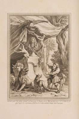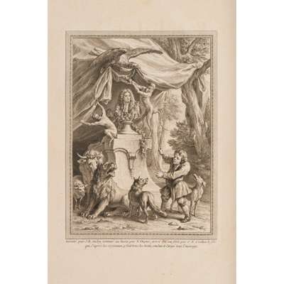 Jean-Baptiste Oudry illustrated de la Fontaine's Fables as a personal and non-commercial project. However, twenty years after their completion, Montenault purchased the works and commissioned Charles-Nicolas Cochin to engrave them. By all accounts, Cochin vastly improved Oudry's drawings of the figures in the work, however the depictions of the animals suffered. Nonetheless, this finished work is considered to be amongst the most ambitious and successful illustrated works ever to have been produced in France.