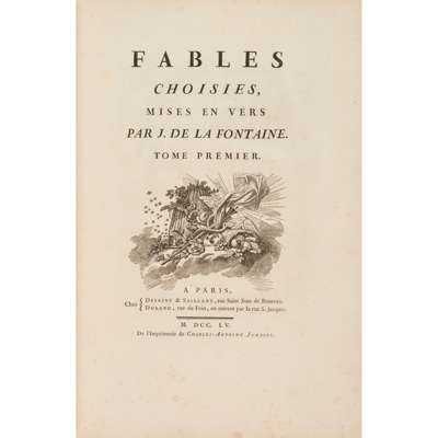 Jean de la Fontaine's collected 'Fables', first issued between 1668 and 1694, are considered to be a classic of French literature. This collection, a large paper issue in four volumes with illustrations by Oudry, is widely regarded as the pinnacle of 18th century French printing.