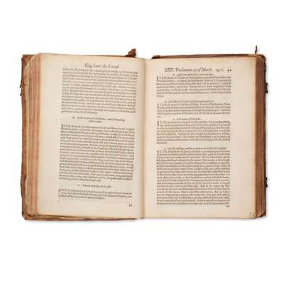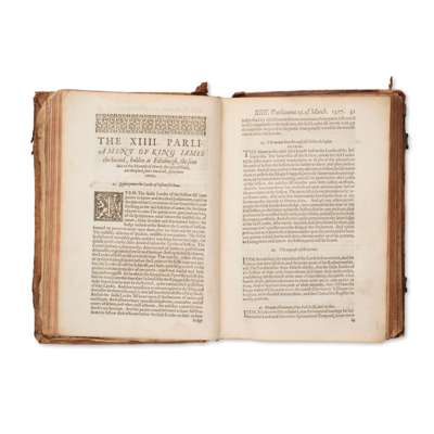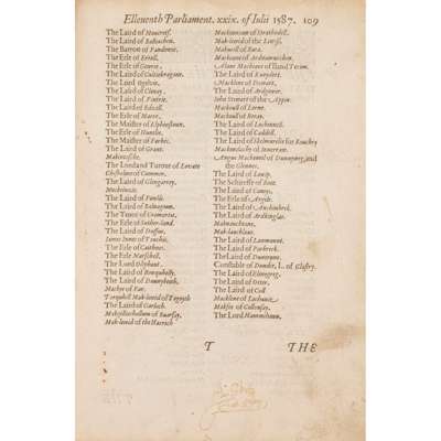 Maid be King James the First, and his Successours Kinges of Scotland… Edinburgh: Robert Waldegrave, 1597. Folio, lacks engraved additional title, folding genealogical table, f.46 (from the first section), ff.160 (from the second section), and around 41 final pages, ff.9 and 10 in part 2 misbound but present, with 14 manuscript leaves written in an early Scottish secretarial hand, a signature seeming to read “A. Skene” to f.109 of the Roll of the Names (possibly Alexander Skene, a younger son of John Skene); [bound with] The Lawes and Acts of Parliament… since his Majesties XV. Parliament…1597. Edinburgh: Evan Tyler, 1647; contemporary calf with remnants of clasps, some browning and spotting, covers rubbed and binding a little loose
