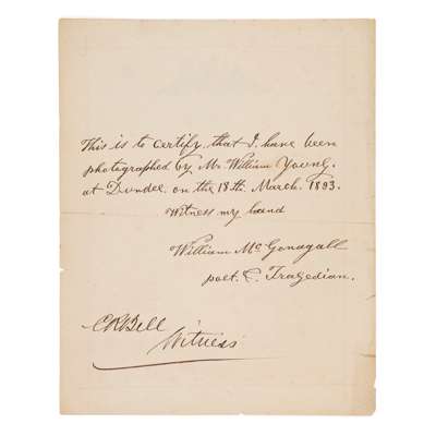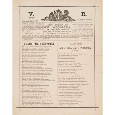 Broadside: New Poems. Beautiful Aberfoyle. Lines in Praise of Mr J. Graham Henderson, Hawick. Dundee: [printed for the author], March 1893. Single sheet, 29 x 23cm, printed on recto only with wood-engraved royal arms to head and two poems each in separate column, inscribed by McGonagall on verso in black ink, ‘This is to certify that I have been photographed by Mr. William Young at Dundee on the 18th March 1893. Witness my hand, William McGonagall, poet and Tragedian’, with the signature of one C. R. Bell as witness below.