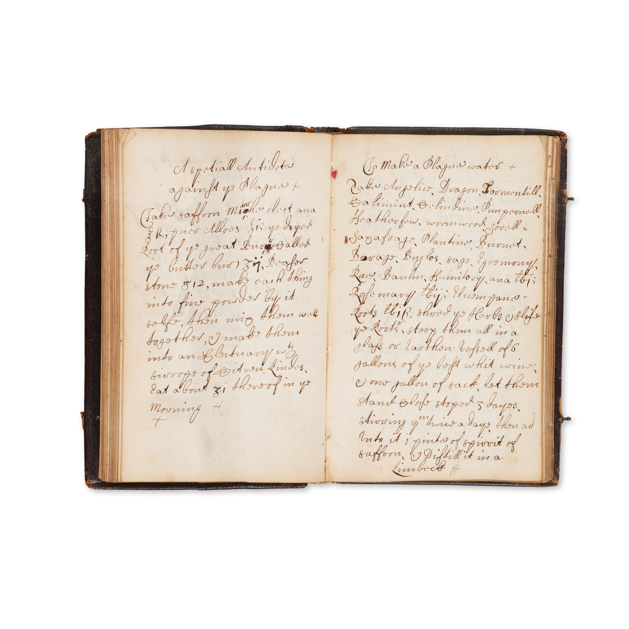 Comprising 82 pages of remedies, at least 25 of these in Fyffe's hand (although further pages may be written by him in a slightly more scrawled hand) including “A digestive truection? for a Deep hollow Wound…”, “A very good Oyl for a wound”, “herb Oyntment, excellent for a Bruis…", “to Stoppe bleeding at ye Nose”, “A pocket perfume for to prevent ye Plague”, “A spetiall Antidote against ye Plague”, “To Make a Plague water”, “A broath for the bloody flux”, “A medicene for the Dropsie”, and others; [WITH] 60 pages of food and drink recipes, including “To make Lemon Cream”, “An orange pudding”, “Whildhall pancakes”, “To make Soop” and “to make chees cake”, the name Griselda Fletcher inscribed to final leaf; contemporary calf bound notebook with provincial gilt tooling, one clasp intact only, 15 x 10cm