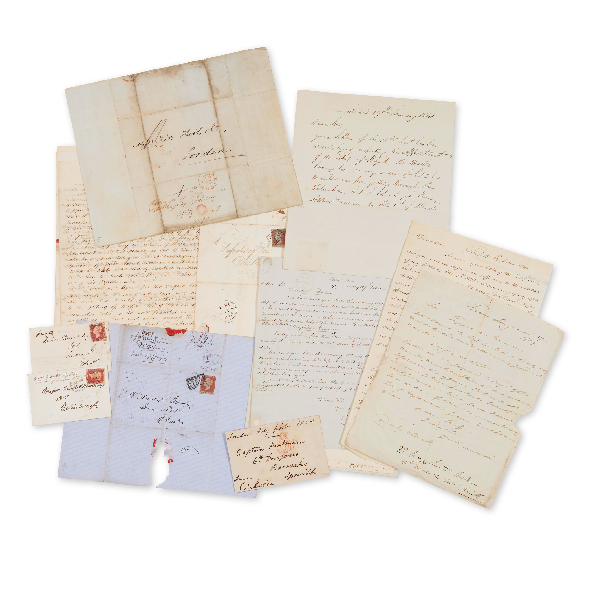 A collection of letters and covers, the letters dealing with every day, mostly Scottish, business and life, including: William Dawson to James McDonald of Inverary, dated Tarbert 12th June 1840, discussing local sales of assets; a letter from John Somerville of Leith to Mr George Darrie of Anstruther, dated 1850, discussing payments; a cover addressed to W Monteith Esq of George Street, Edinburgh, dared 1852?, bearing a red one penny stamp; and a quantity of others (23)