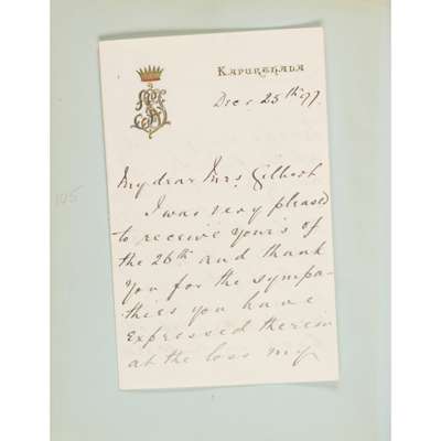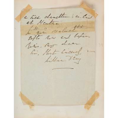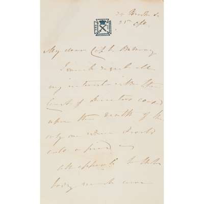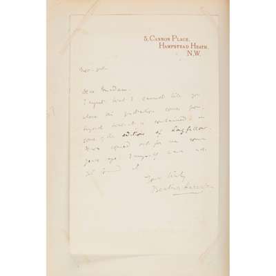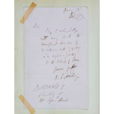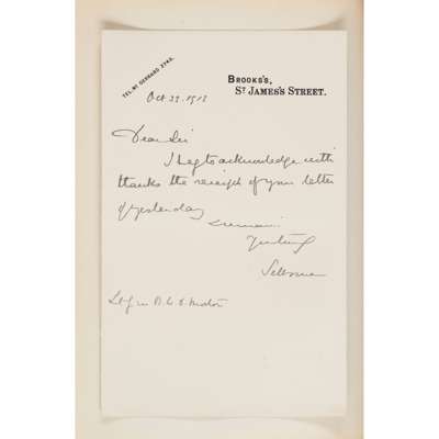 Autograph letter signed from Henry Foley, 22nd Oct. 1898; Marquis of Dufferin & Ava, sending a photograph, 10th Dec. 1888; autograph letter signed from George Baden-Powell, 11th Nov. 1893; clipped signature of W.E. Gladstone, E.H. Plumptree, Dean Farrar, on the inadvisability of founding yet another Temperance Society, undated; autograph letter signed from Hallam Tennyson to Baden-Powell; autograph letter signed from Ellen Bayly, 30th Oct. 1893; autograph letter signed from Beatrice Harraden, undated; autograph letter signed from Anthony H. Hawkins, 23rd May 1900; a note signed from Alma Tadema, 15th Sept. 1896, clipped signature of Richard F. Burton; autograph letter signed from Raja Sir Jagatjit Singh, ruler of Kapurthala, 3 pages, 25th Dec. 1897, mostly written to General Morton or his daughter Miss Amy Morton, red morocco gilt album