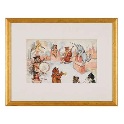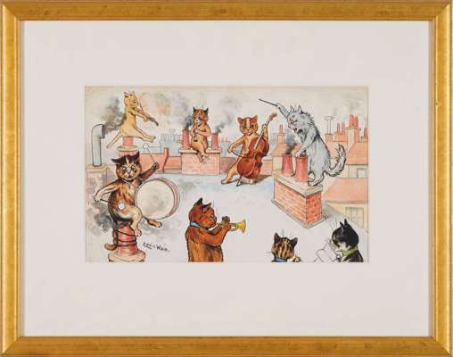 Design for postcard from Louis Wain's “Valentine's Series”, c.1905, in pencil and watercolour on paper, with title in pencil to lower margin and “title here in sky” in pencil to upper margin, 27.5 x 37cm, signed, framed and glazed