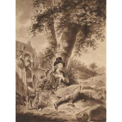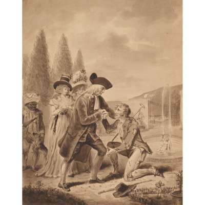Four ink wash illustrations: Prodigal Son No.340 Plate 1, showing a family scene with the son leaving, a replacement image of a dog pasted onto the original; Prodigal Son No.340 Plate 2, showing the son drinking and fraternizing with women; Prodigal Son No.340 Plate 3, showing the son as destitute and sleeping under a tree surrounded by pigs; Prodigal Son No.340 Plate 4, showing the son's return to his father; each c. 32 x 24cm with the aforementioned titles and “I. Cruikshank's Delit. …” to the reverse of each image; possibly by, or after, Isaac Cruikshank, each laid down by one edge onto paper;