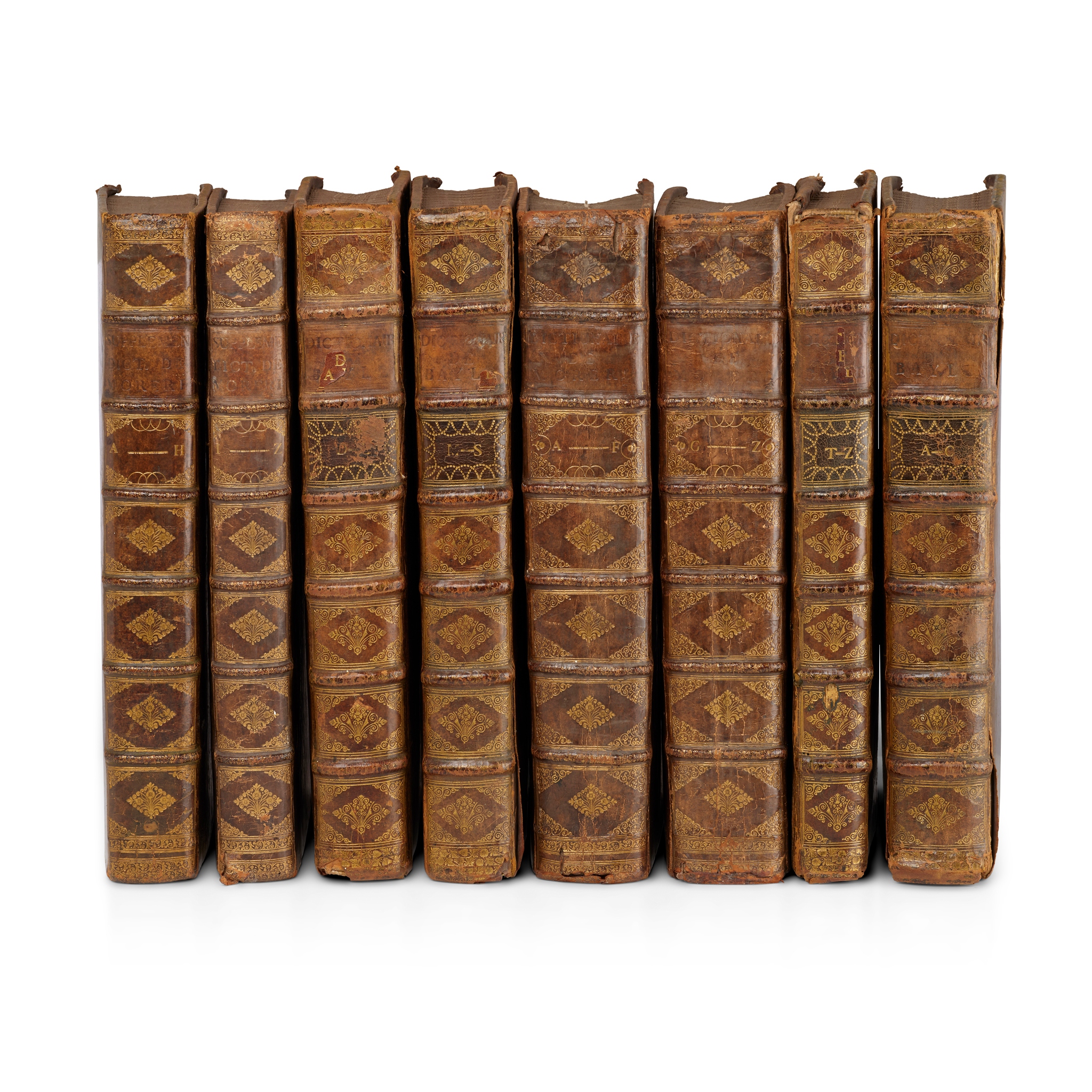 Idem. Supplément aux anciennes éditions du grand dictionnaire historique. Amsterdam: Pierre Brunel [and others], 2 volumes, folio (39.2 x 23.2cm), contemporary calf uniform with the preceding work, half-titles, title-pages in red and black (8)