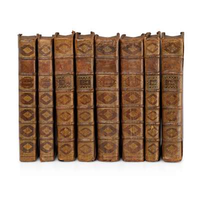 Moréri, Louis. Le grand dictionnaire historique. Amsterdam: Pierre Brunel [and others], 1724. Eleventh edition, 4 volumes in 2, folio (39.5 x 23.8cm), contemporary calf, gilt spines, half-titles, engraved frontispiece to volume 1, title-pages in red and black;