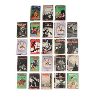 all 8vo, original cloth,, references to Hubin, Crime Fiction II (1994) in square brackets, titles include: Gordon Latta, Exit Arnholt, 1935, first edition, first-issue jacket priced at 7/6 on front flap but with 1/ overprice sticker to spine [p. 486]; Michael Salkeld, 1936, first edition, jacket with 4/6 overprice sticker, loss to head of jacket spine with ensuing fading to cloth, old tape repairs to verso of jacket [p. 714: the author's only novel listed]; David Whitelaw, The Face, 1937, first edition, jacket with 4/6 overprice sticker to spine, contemporary gift inscription to front pastedown [p. 859]; Gilbert Collins, The Haven of Unrest, 1936, first edition, dustacket with 4/6 overprice sticker and repairs verso [p. 179]. Together with 9 similar Geoffrey Bles detective novels, 7 Collins Crime Club Novels, and 3 Hutchinson detective novels, all in dust jackets (23)