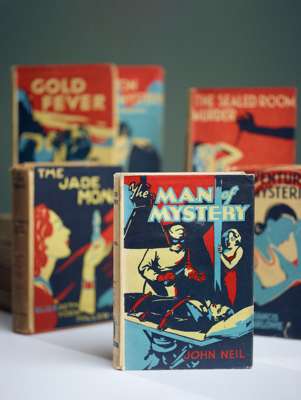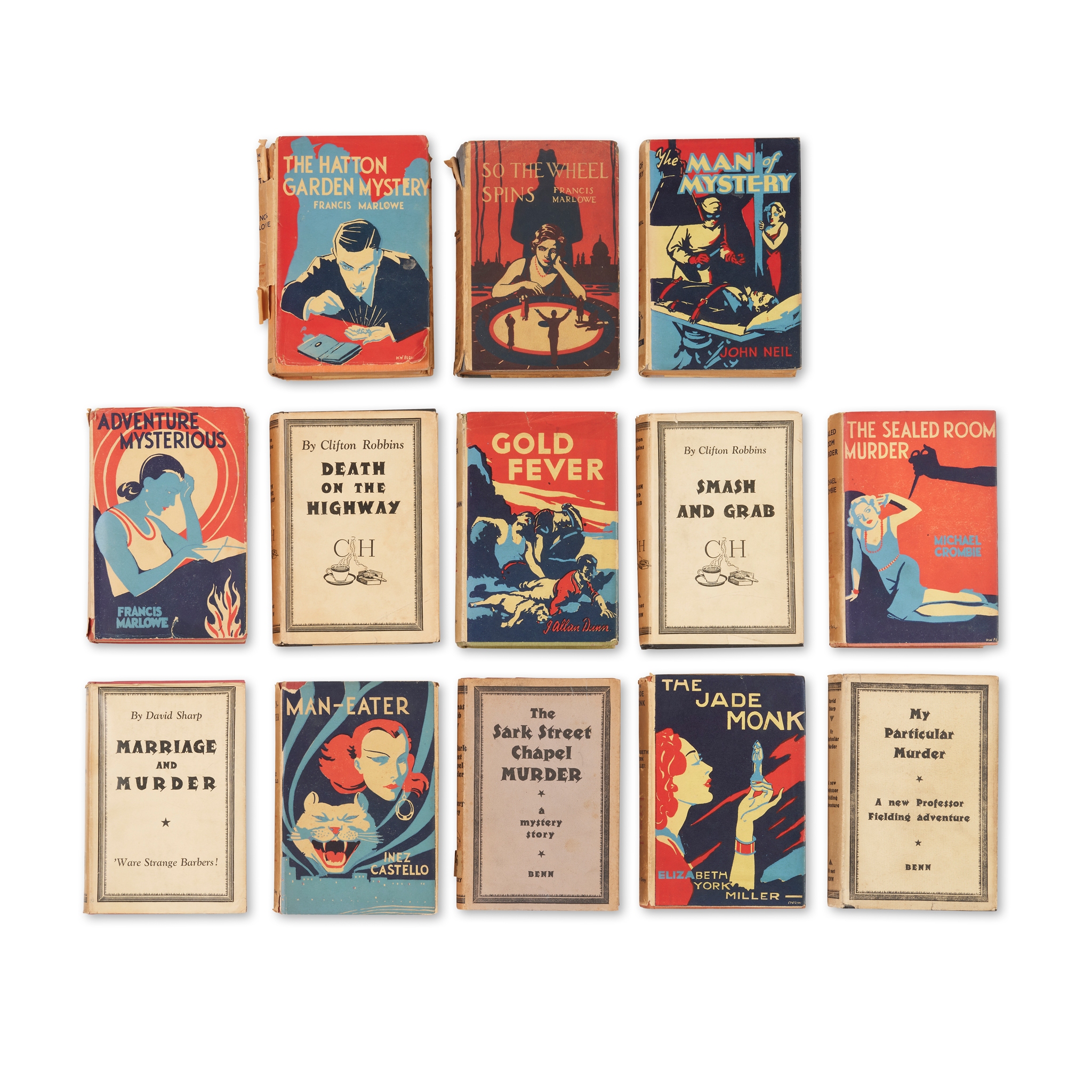 undated but several of the works dated in Hubin or library records as 1934 or 1936, 8vo, original cloth, with the dust jackets, textblocks browned, references to Hubin, Crime Fiction II (1994) in square brackets, titles comprising: 1) Michael Crombie, The Sealed Room Murder, ownership inscription to front free endpaper [p. 202; Library Hub cites the British Library copy only], 2) Elizabeth York Miller, The Jade Monk, worming to foot of gutter to pp. 189-238 [N/A but see p. 574 for the author], 3) John Neil, The Man of Mystery, overprice sticker to jacket spine [N/A but p. 598 for the author], 4) Inez Castello, Man-Eater, 5) Francis Marlowe, Adventure Mysterious. Together with: