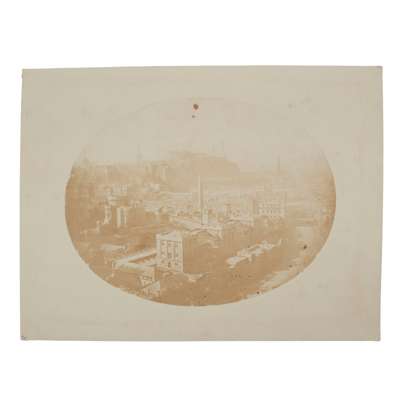 Oval salt print photograph of Edinburgh from Calton Hill, early 1850s, 26 x 19.5cm, mounted on card, very similar to oval print from c.1850 by Ross and Thomson showing the city from the opposite direction (see nationalgalleries.org), faded but still good detail, some marks to surface, mostly original retouching