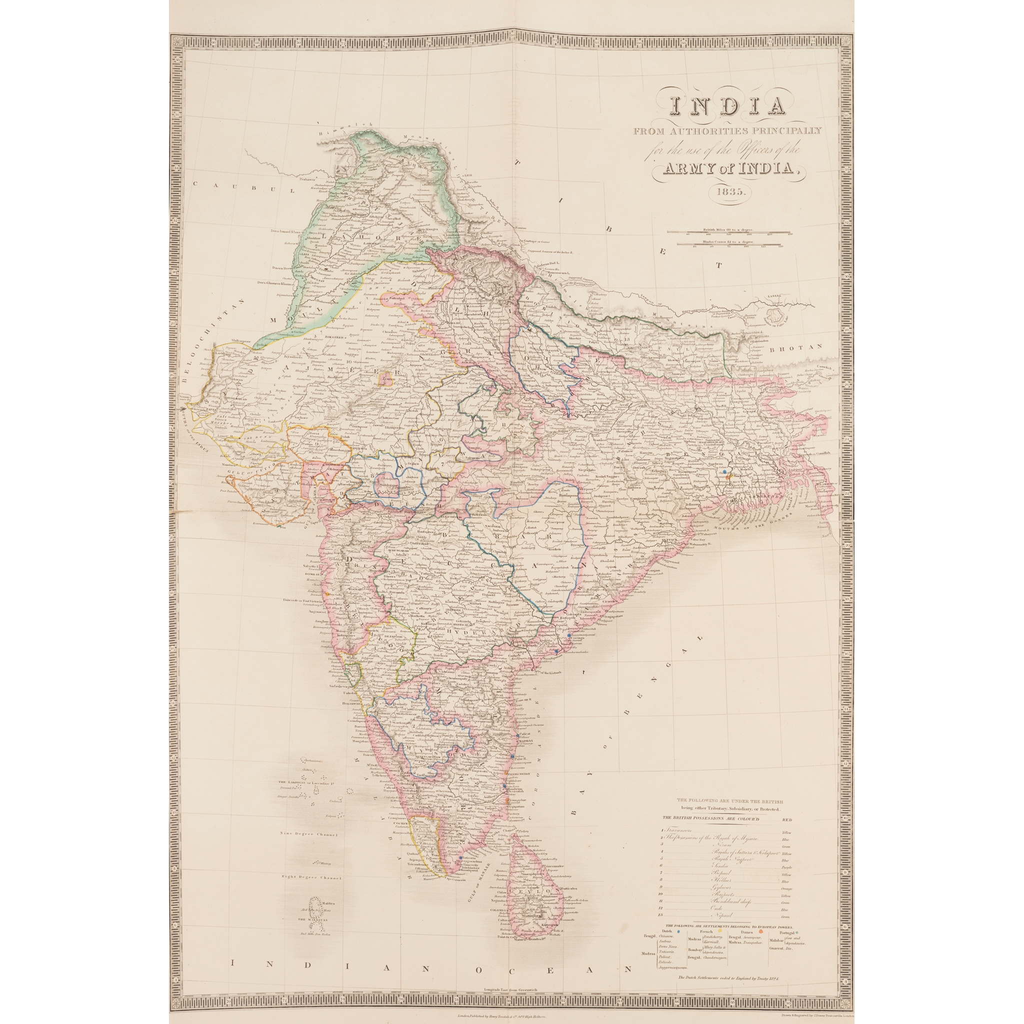 London: Henry Teesdale & Co., 1838. Folio, contemporary green half roan, engraved folding title-page, folding letterpress contents leaf, 46 engraved folding maps by John Dower, all hand-coloured in outline, one of which (‘India, from Authorities principally for the Use of the Army of India, 1835') on two sheets and opening to 70.5 x 44.5cm (with short split to edge of transverse fold), the remainder opening to 37.5 x 47cm, engraved double-page plate 'A Comparative View of the Heights of the Principal Mountains and Lengths of the Principal Rivers of the World, maps including ‘Birman Empire and Countries South East of the Ganges’, ‘China and Japan’, ‘Colony of New South Wales’ (with inset map of the Swan River Settlement), ‘Van-Diemans Land' (finger-soiling to margin), ‘Chart of the Pacific Ocean’ (short split to foot of central fold), and several dedicated maps of the Americas, shallow damp-stain to head of gutter never affecting images, binding worn, front board detached;